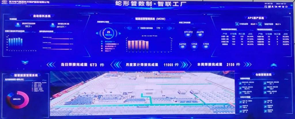 数字化智能化赋能全新生产模式。作为大型能源装备制造领域复杂产品多工序集成智能制造样板工程,该工厂广泛应用机器人、AGV、智能焊接集群、工业互联网、人工智能、数字孪生等新一代制造技术和信息技术,并集成了数字化备料中心和数字化管屏自动生产线,为全面掌握工厂运行状态和智能化决策提供数据支撑,实现了生产计划自动化、管料加工自动化、焊接加工自动化、在线检测自动化、物料转运自动化,构建起蛇形管“套圈”生产的全新模式,做到让生产更高效、作业更安全、质量更可靠,设备数字化率达到100%,人均产值提升250%。