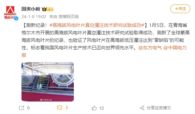 【刷新纪录!#高海拔风电叶片真空灌注技术研究试验成功#】1月5日,在青海省格尔木市开展的高海拔风电叶片真空灌注技术研究试验取得成功,刷新了全球最高海拔风电叶片的纪录,也验证了风电叶片在高海拔低压灌注达到“零缺陷”的可能性,标志着我国风电叶片生产技术已迈向世界领先水平。@918博天堂电气@中国电力报