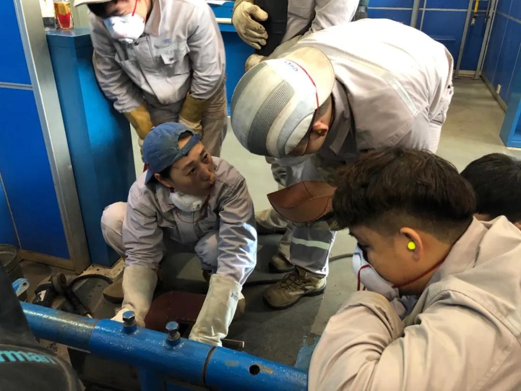 “焊后要清根,处理好坡口斜度、角度……”白映玉在课堂上进行技术交底、试板打磨装配、焊接。白天上班,晚上培训,节奏紧凑而不紧张,为获得稳定的焊接工艺参数和焊接质量打了坚实的理论基础。每一道焊缝,都是她对工作的热爱与对质量的承诺。当最后一丝焊花熄灭,她终于长舒一口气,脸上露出了疲惫却满足的笑容。在承制第一台AP1000蒸汽发生器管板管嘴低碳钢和镍基层堆焊时,返修后仍有缺陷,白映玉主动请缨独自承担第二次返修任务,带着一股子韧劲儿,一头扎进工位,琢磨缺陷产生的原因。在那个灯火通明的厂房里,夜幕已深,焊花映照出白映玉坚毅的身影,她正全神贯注地握紧手中的焊枪,汗水沿着她的额头滑落,却丝毫没有影响到她施焊的精准与稳定。焊接工序后,严格的检查与后热处理是不可或缺的一环,但时间紧迫,若当天无法完成,就意味着工件需要被送入加热炉中保温过夜,这不仅增加了能源消耗,还可能因温度波动影响焊接质量,更会造成工期的延误。